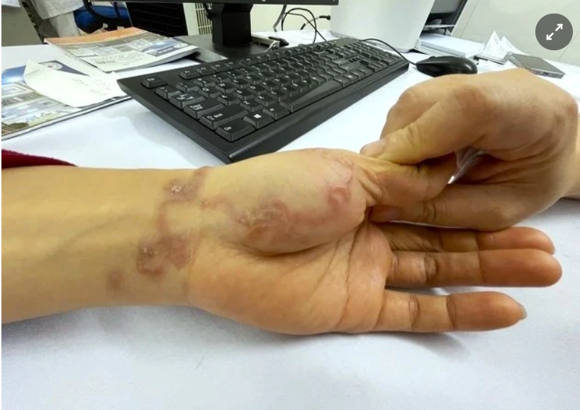 Sau khi nhập viện tuyến cơ sở, người phụ nữ được điều trị triệu chứng. Nhưng bà L. còn xuất hiện các tổn thương ngoài da như sẩn ngứa và các đường hằn tròn trên tay và cơ thể, kèm theo dấu hiệu sán di chuyển dưới da. Sau đó, bệnh nhân được chuyển đến Bệnh viện Bệnh Nhiệt đới Trung ương (Hà Nội).