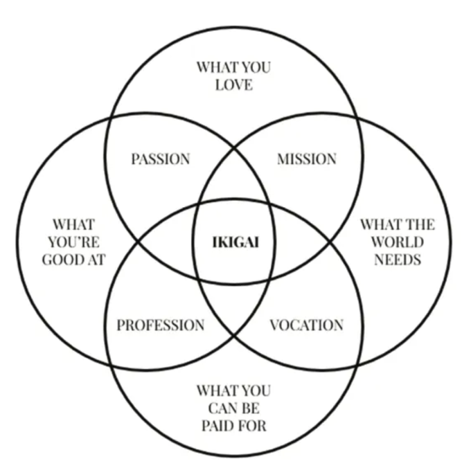 Nhưng để xác định những hoạt động nào mang lại mục đích sống, George đã tham khảo khái niệm ikigai của người Nhật, mang ý nghĩa "lý do tồn tại của tôi". Ở phiên bản phương Tây của khái niệm này thuờng dựa trên bốn câu hỏi mà một người phải hoàn thành. Cụ thể: