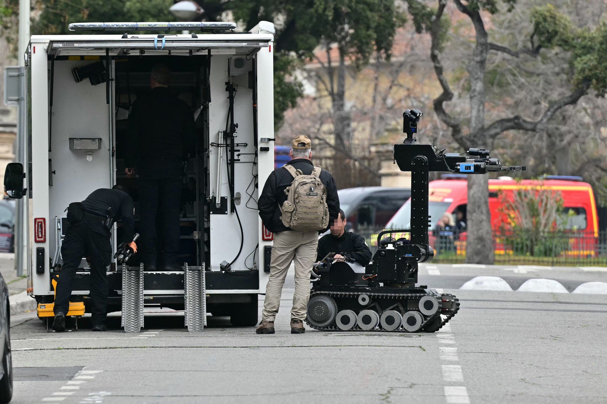 Đội rà bom đưa robot đến trước tổng lãnh sự quán Nga ở Marseille, sau khi nơi này có kẻ lạ liệng kíp nổ ngày 24/2/2025. (Ảnh: MIGUEL MEDINA/AFP/Getty Images)