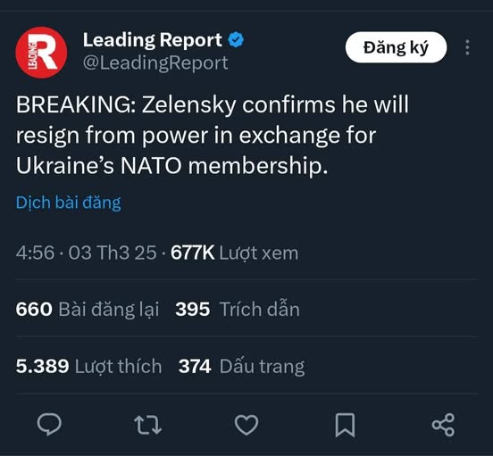 Zelensky đang xin từ chức nếu Ukraine gia nhập NATO ngay lập tức. Ukraine ko đủ điều gia nhập NATO vì đang có tranh chấp với Nga. Đây là điều kiện xương sống ko thể bị phá vỡ. Nhưng nếu nó bị phá vỡ thì sao? "Mọi thành viên NATO phải bảo vệ cho thành viên NATO nếu đang có chiến sự". Nếu quy tắc xương sống bị bỏ qua để ưu ái Ukraine, đây chính là châm ngòi cho Thế chiến thứ 3. Zelensky mưu toan cho việc này, vì vậy peace deal đã bị hắn hất bỏ. Donald Trump và Elon vừa bày tỏ quan điểm rút khỏi NATO để tranh 1 cuộc chiến giết chóc vô nghĩa. Các bạn đang chứng kiến cuộc chiến thầm lặng giữa tự do và độc tài, cuộc chiến này xác định lằn ranh giữa hòa bình và chiến tranh. Vừa rồi Canada đã cho biết đã gửi quân đội đến NATO rồi. Chuẩn bị sẽ có các nước thành viên khác đồng loạt gửi quân đến Ukraine. Chỉ cần Ukraine được vào NATO, hàng triệu con người sẽ chết vì mong muốn của kẻ đứng sau toàn bộ việc này.