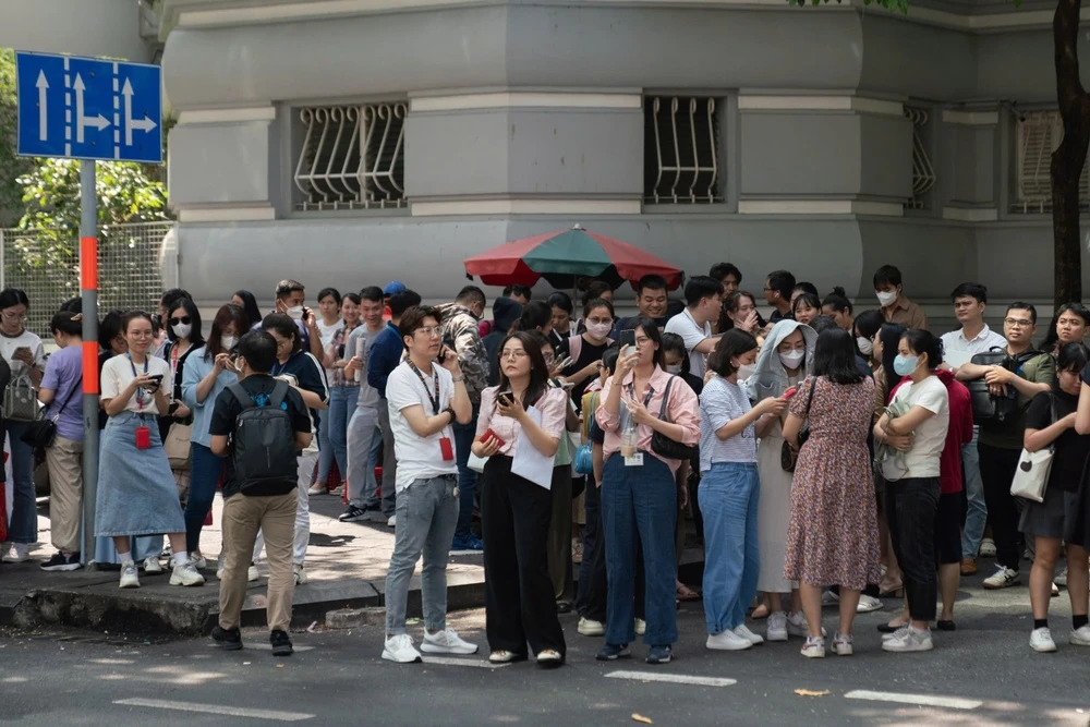 Dân văn phòng ở quận 1, TP.HCM rời tòa nhà văn phòng vào trưa ngày 28/3 do cảm nhận sự rung lắc. (Ảnh: Linh Huỳnh)