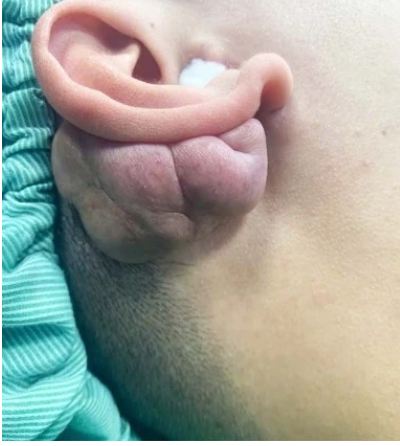 Khối u che hết vành tai của nam thanh niên. Ảnh: BVCC.