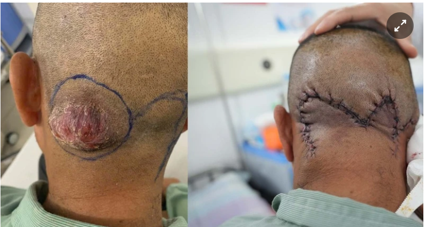 Các bác sĩ đã khám và hội chẩn chỉ định phẫu thuật, lên kế hoạch kỹ lưỡng cho việc cắt rộng u và chuyển vạt che phủ tổn khuyết. Ca mổ diễn ra thành công, sau phẫu thuật, vạt chuyển hồng hào, vết mổ khô, liền sẹo nhanh.