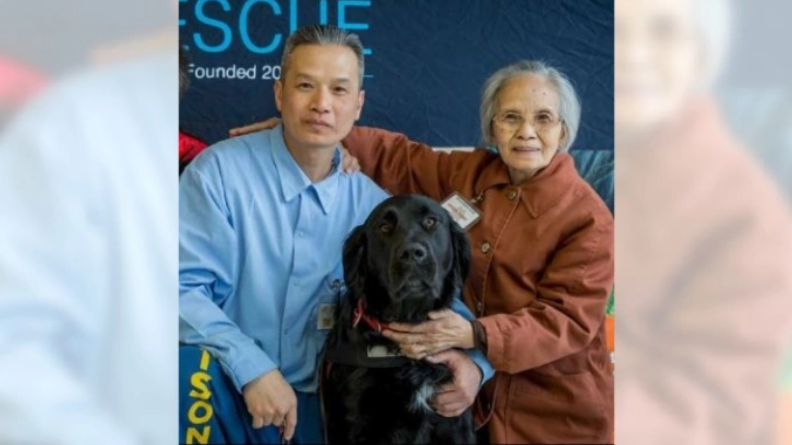 Ông Tin Nguyen và mẹ, bà Thi Cuc Le, 84 tuổi, ở hạt San Bernardino, tại lễ tốt nghiệp chương trình dạy tù nhân huấn luyện chó trị liệu vào năm 2018. Ảnh: VietRise.