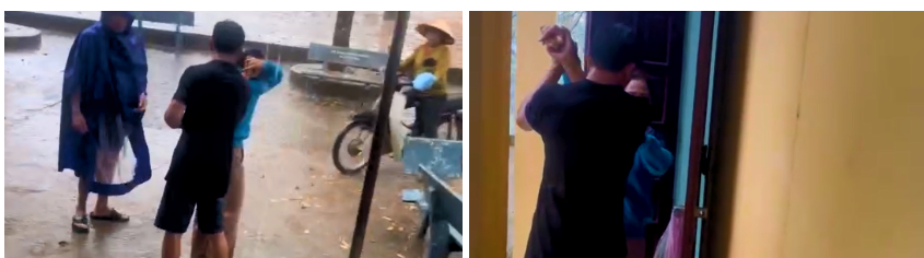 Mặc dù được can ngăn, nhưng người đàn ông vẫn ghì chặt tay, đẩy cô giáo ra phía ngoài, bắt đứng giữa mưa. Ảnh cắt từ clip.