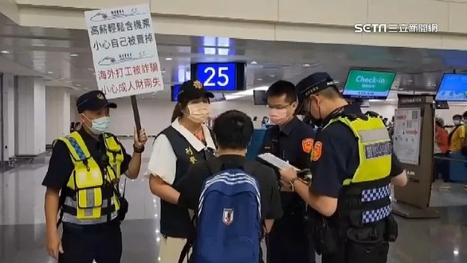 Cảnh sát giơ bảng tuyên truyền chống lừa đảo tại sân bay Đào Viên. Ảnh: SETN