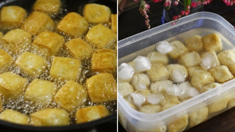 Với cách ngâm đậu rán vào nước lạnh như vậy, miếng đậu sẽ giòn hơn, bên trong vẫn giữ được độ mềm ẩm.