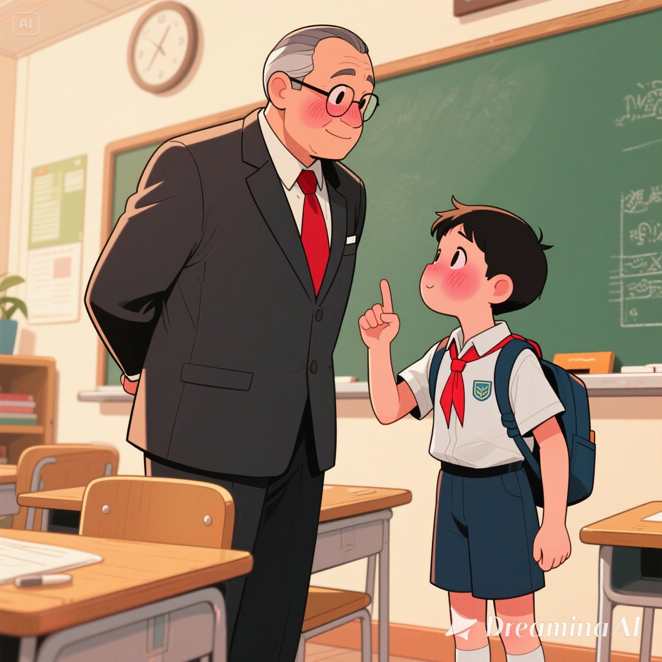 Ông hiệu trưởng ra dấu không cho bé Tèo trả lời nhưng bé Tèo đáp ngay