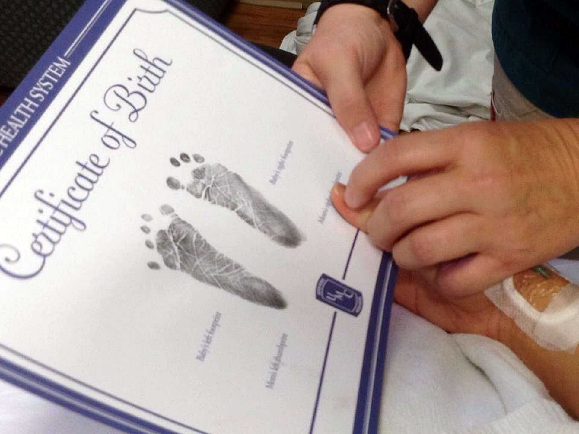 Cô y tá bôi đen lòng bàn chân của bé và ngón tay của mẹ rồi in lên trên tờ giấy khai sinh của bệnh viện để làm kỷ niệm
