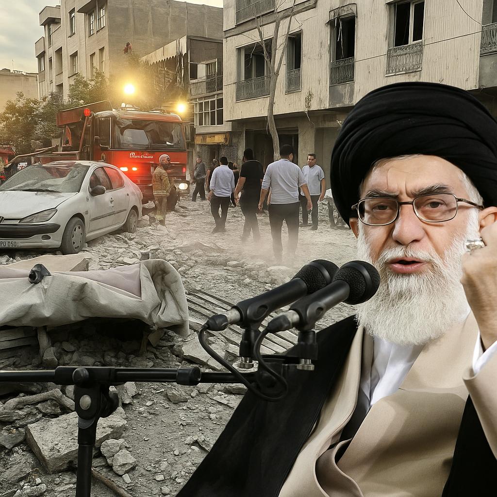 Một h́nh ảnh tổng hợp được tạo ra bởi ChatGPT kết hợp cảnh tàn phá ở Iran (nguồn: Ynetnews) với ảnh của Đại giáo chủ Ali Khamenei (nguồn: Wikipedia)