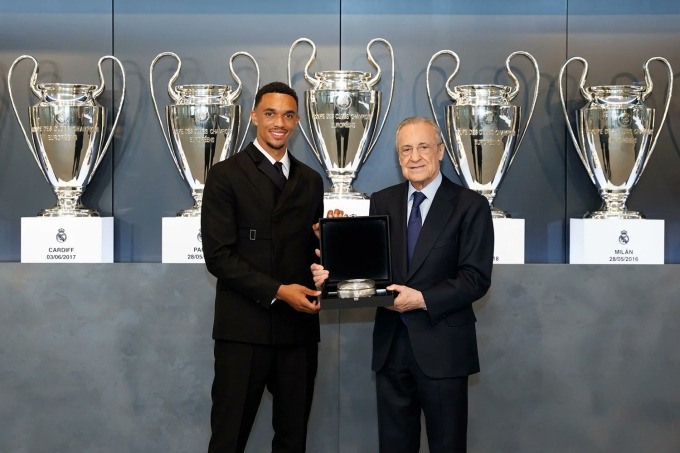 Chủ tịch Perez (phải) trong ngày ra mắt tân binh Trent Alexander-Arnold ở sân Bernabeu, ngày 11/6/2025. Ảnh: Real
