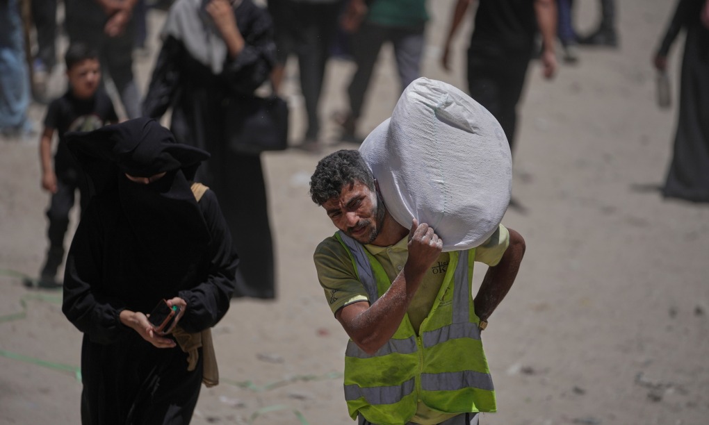 Người dân Palestine vác túi bột mì được viện trợ tại Gaza City hôm 12/7. Ảnh: AP