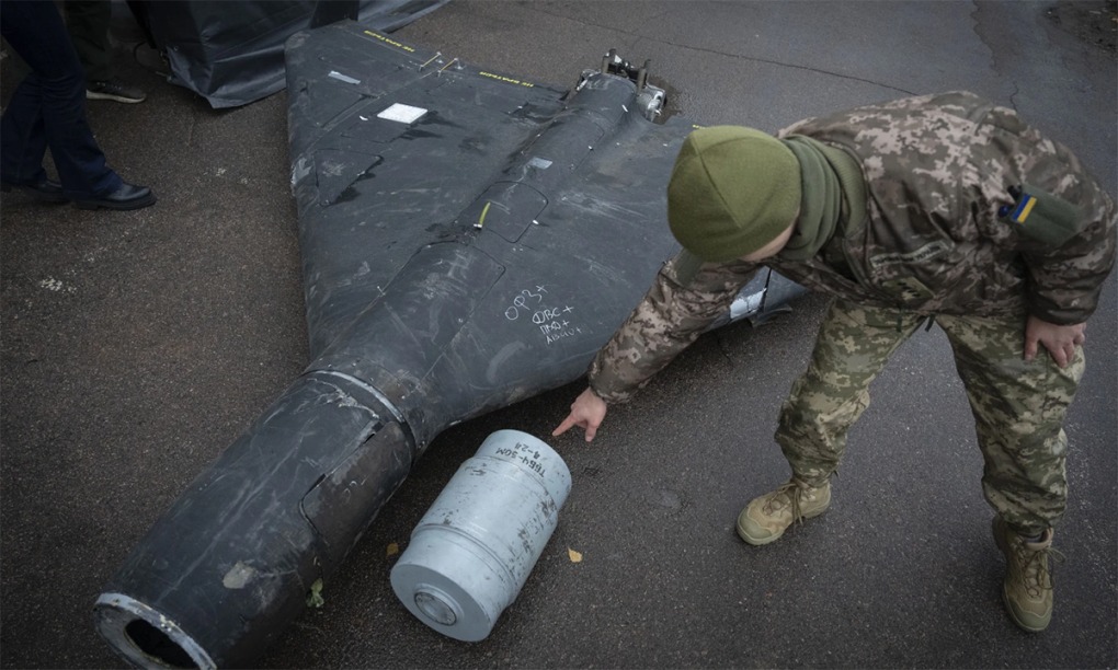 Binh sĩ Ukraine đứng cạnh xác UAV dòng Geran mang đầu đạn nhiệt áp tháng 11/2024. Ảnh: AP