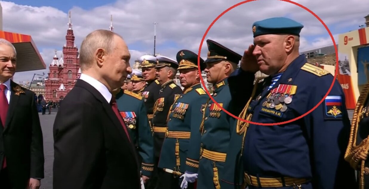 Một đại tá của quân đội Nga và một đại tá của lực lượng không quân Nga đang chào và bắt tay Tổng thống Vladimir Putin, được nhìn thấy trong cả đoạn video trên và video chính thức về lễ duyệt binh Ngày Chiến thắng năm nay. Ảnh chụp màn hình video chính thức về lễ duyệt binh Ngày Chiến thắng 9/5/2025