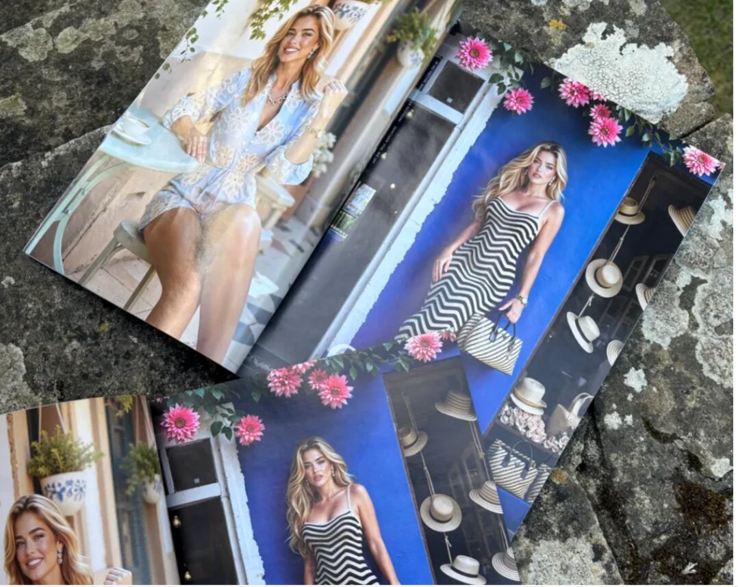 Trong ấn bản tạp chí Vogue tháng 8, hãng Guess đăng tải hình ảnh quảng cáo của một người mẫu tóc vàng mặc váy maxi kẻ sọc và jumpsuit hoa từ BST mùa hè. Một dòng chữ nhỏ ở góc trang tiết lộ người mẫu là sản phẩm của AI.