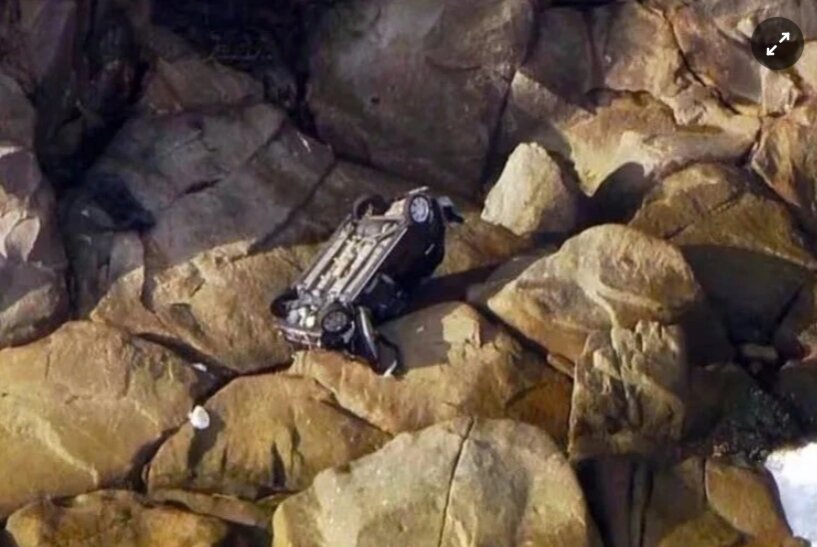 Chiếc xe của người phụ nữ lao xuống vách đá, hư hại nghiêm trọng. Ảnh: TBS.