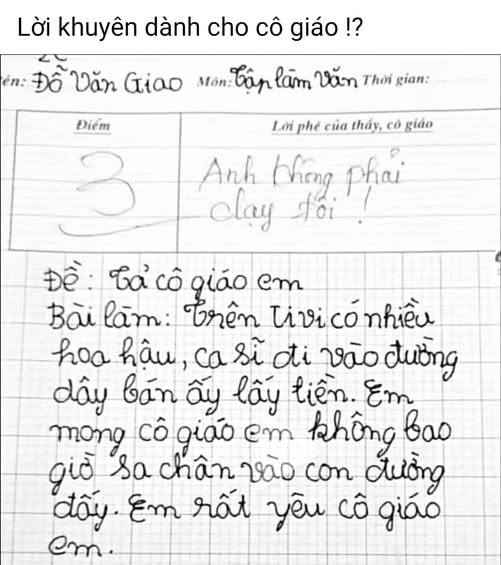 Cô giáo đọc xong, tay run run… không biết nên khóc hay cười. Sau vài giây định thần, cô viết lời phê: “Anh không phải dạy tôi!” và nhẹ tay chấm điểm: 3.0