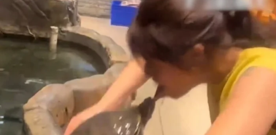 Theo thông tin từ người có mặt tại hiện trường, sự việc diễn ra vào ngày 30/7, một người phụ nữ đã tiến lại gần chiếc bể cá của nhà hàng rồi thản nhiên bắt 1 chú rùa mai mềm. Không rõ vì tò mò hay đơn thuần là muốn đùa vui mà cô đã chu môi trêu chọc con rùa tưởng như ngoan ngoãn. Tuy nhiên, trong tích tắc, con rùa bất ngờ vươn đầu cắn chặt môi cô, khiến mọi người xung quanh hoảng hốt.