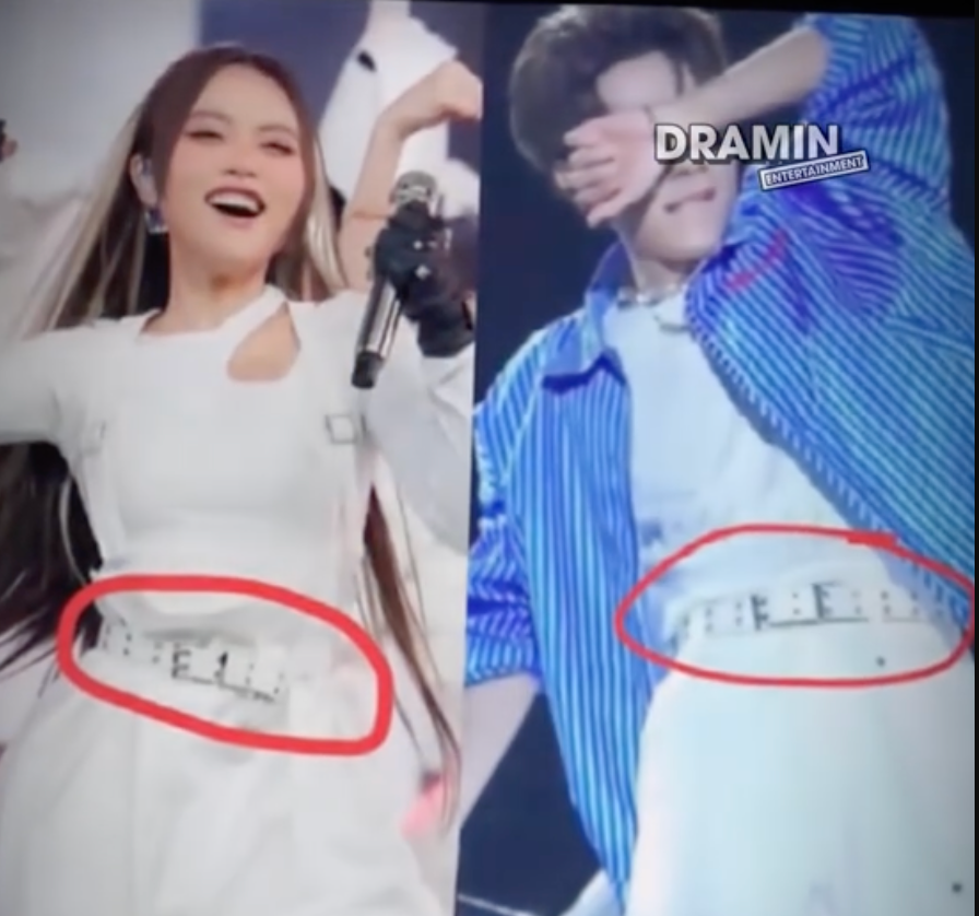 Theo đó, "bà hàng xóm" soi được từ sân khấu biểu diễn đến đời thường, cả hai liên tục để lộ những item giống hệt nhau như đeo chung một mẫu thắt lưng trắng bản to với hàng lỗ kim loại cá tính, diện từ outfit biểu diễn đến streetstyle. Không chỉ vậy, cặp dây chuyền ngọc trai kèm charm bạc cũng xuất hiện trên cả nam và nữ, tạo cảm giác như đồ đôi có chủ đích.