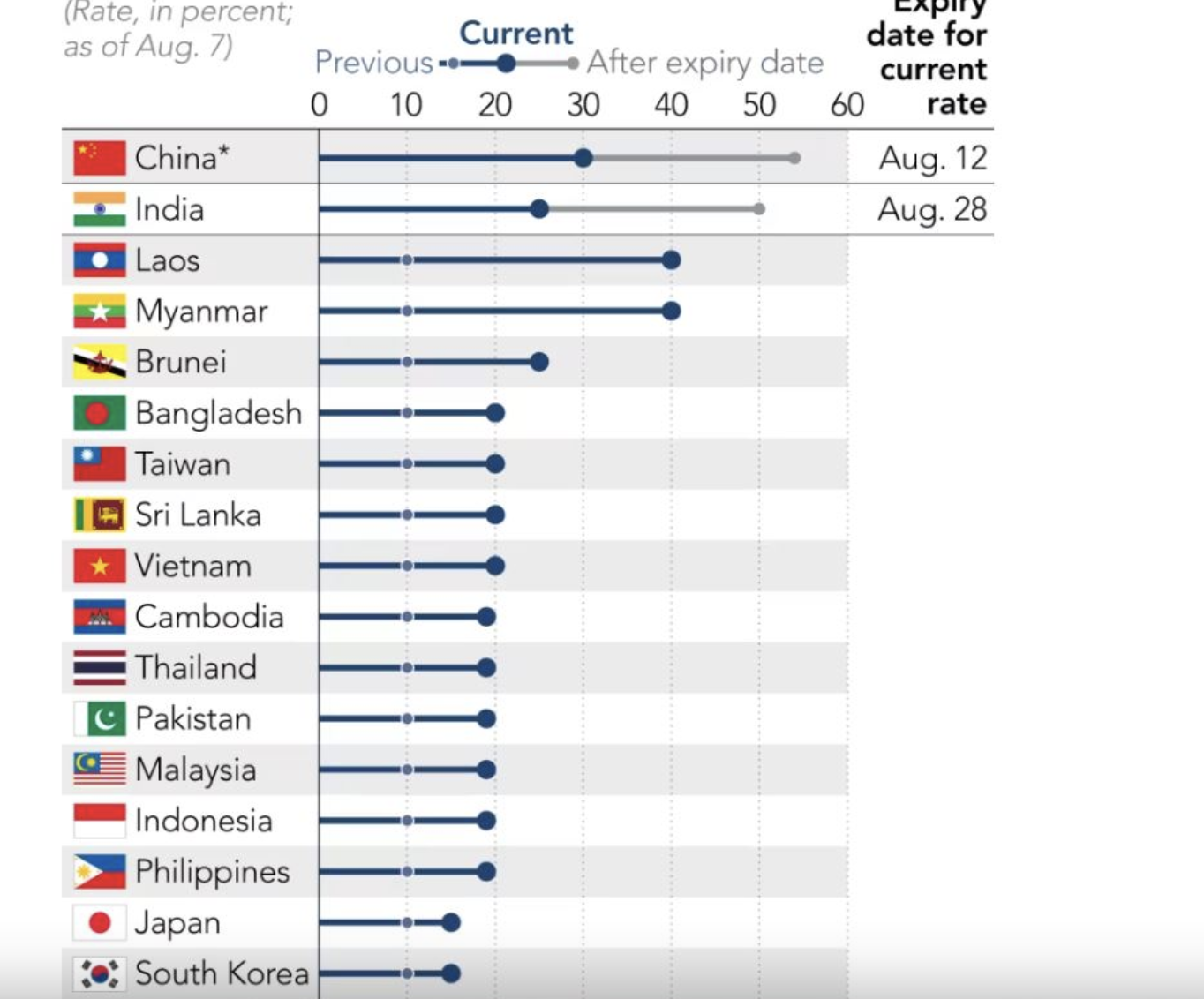 Hầu hết các quốc gia đều chịu mức thuế thấp hơn mức ban đầu. Trong khi đó, Brazil (50%), Thụy Sĩ (39% - mức thuế trước đó là 31% ) và New Zealand (15% - trước đó là 10%), phải chịu mức thuế cao hơn so với mức thuế được công bố vào tháng 4.