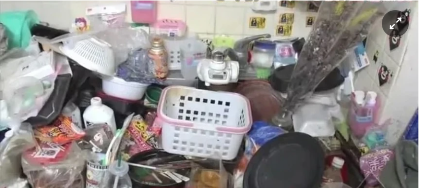 Cửa ra vào chất đầy thùng hàng chưa mở. Phòng khách chật kín sách, lon và túi mua sắm. Bếp phủ đầy gia vị, bát đĩa, nồi cơm điện hỏng, nhiều thực phẩm chưa mở đã quá hạn. Cửa phòng ngủ chỉ hé được một chút vì bị đồ đạc chắn.