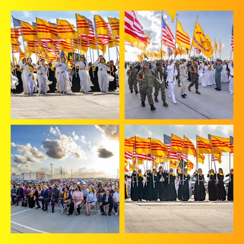Ngay từ buổi chiều, hàng ngàn đồng hương đã quy tụ, tạo thành một biển cờ vàng và cờ Mỹ kéo dài bất tận. Những tà áo dài trắng thướt tha, những tà áo đen nghiêm trang, xen lẫn các võ sinh trong đồng phục võ đạo, đồng loạt bước đi trong khí thế trang nghiêm. Mỗi bước chân, mỗi lá cờ như là nhịp tim chung, nhắc nhở rằng dù đã xa quê hương nửa vòng trái đất, người Việt vẫn không quên nguồn cội.