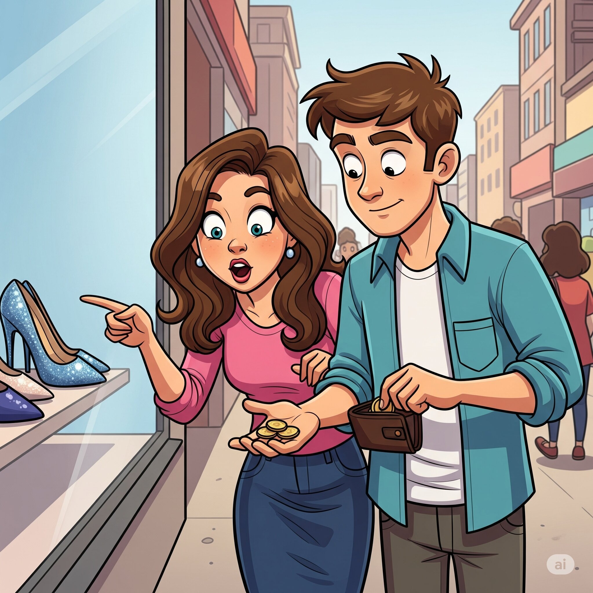 Một cô gái đang đi dạo với bạn trai. Bỗng cô dừng lại trước cửa hàng giày, mắt sáng rỡ: