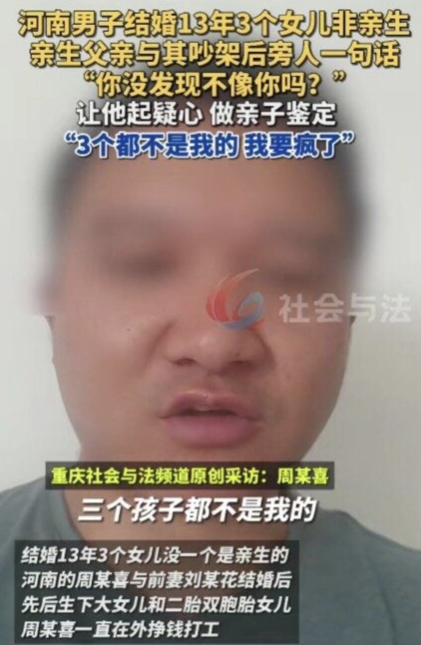 Sau 13 năm chung sống với vợ, một người đàn ông tại Trung Quốc đã vô cùng đau khổ khi phát hiện ra không những bản thân bị phản bội trắng trợn mà 3 đứa con của họ cũng không phải là con ruột của anh.