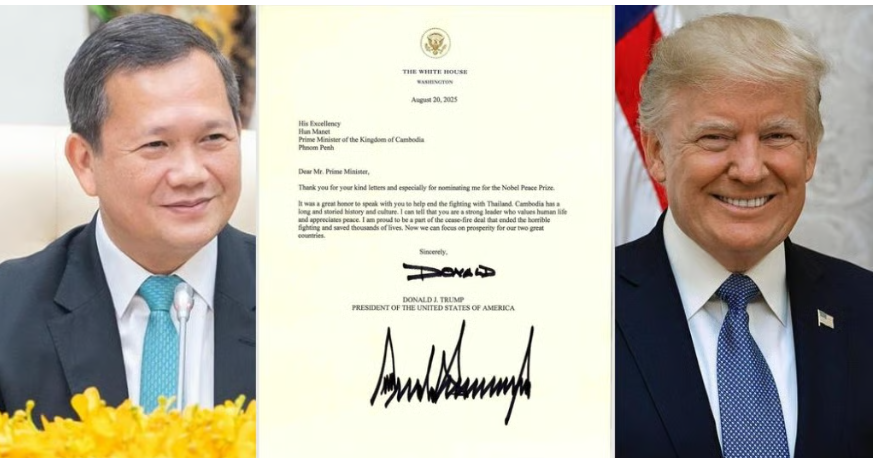 Trong một bức thư đề ngày 20/8 và được Thủ tướng Hun Manet công bố trên tài khoản mạng xã hội Facebook chính thức của mình vào tối 27/8, Tổng thống Trump đã cảm ơn nhà lãnh đạo Campuchia vì "những bức thư tử tế" và việc đề cử, mô tả đây là một "vinh dự lớn".