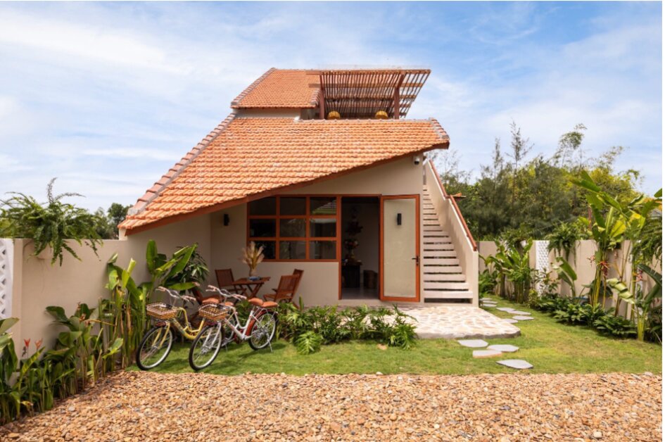 Vợ chồng chị Vy mong muốn ngôi nhà mang kiến trúc làng quê, sử dụng ngói và gỗ, những vật liệu bền vững với môi trường, thích nghi tốt với khí hậu ven biển.