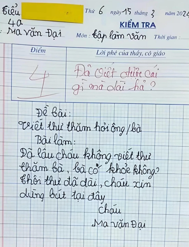 Old  Default Cười ngất với bài văn “thư hỏi thăm bà”: Mới mở đầu đã kết thúc, cô giáo chấm 4 điểm không oan!