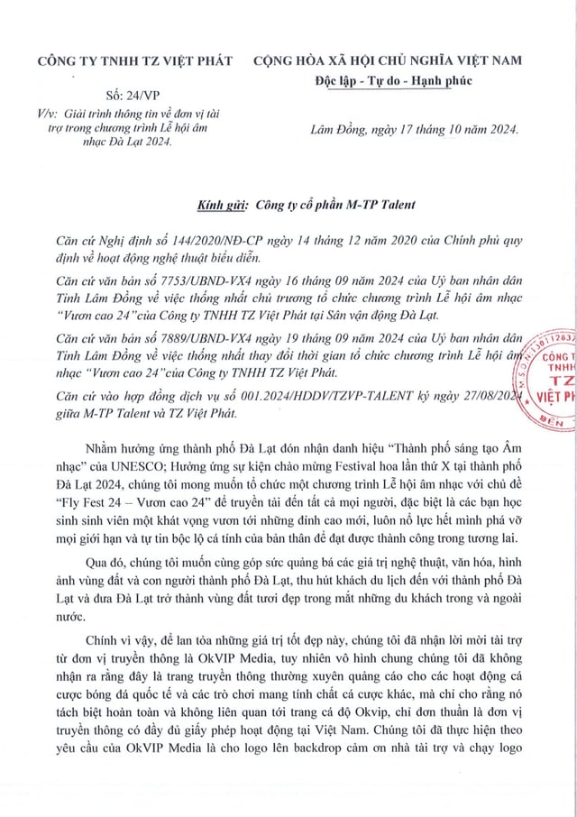 Ngoài ra, M-TP Talent còn đính kèm công văn phản hồi từ Công ty TNHH TZ Việt Phát số 24/VP ngày 17/10/2024, trong đó đơn vị tổ chức đã thừa nhận trách nhiệm và xin lỗi về sự việc này.