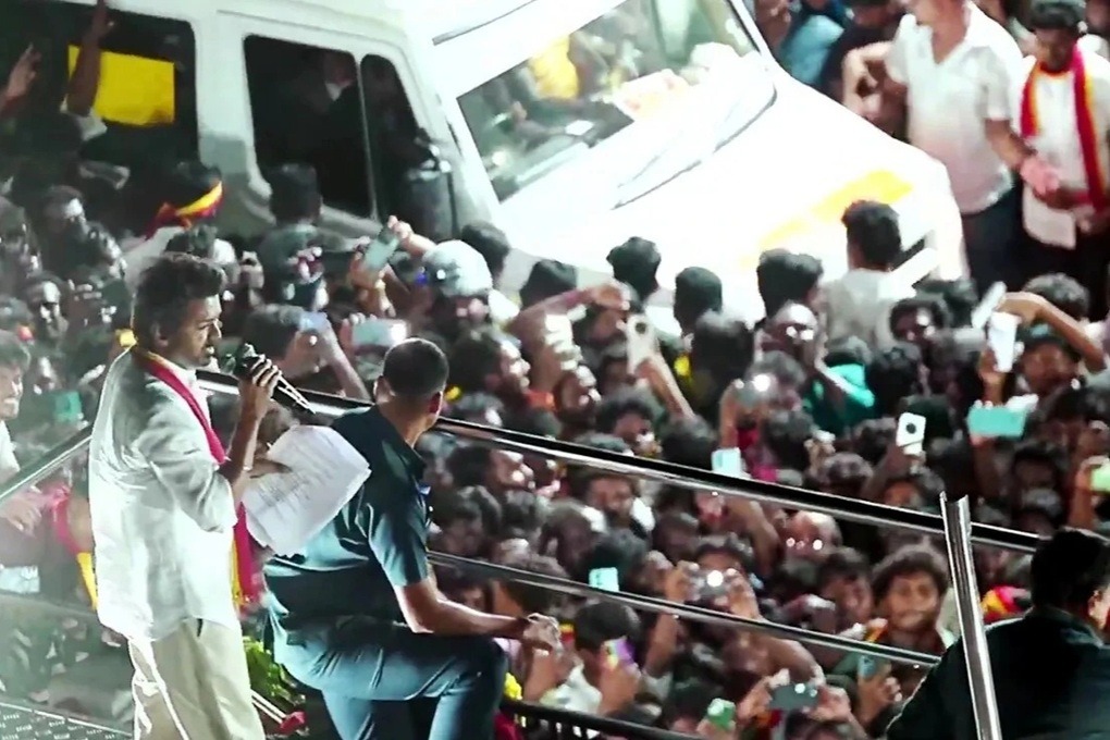 Các đoạn video do truyền thông địa phương ghi lại cho thấy hàng nghìn người bao vây một xe vận động lớn, nơi ông Vijay đứng trên nóc và phát biểu. Trong cuộc mít tinh, ông Vijay ném chai nước xuống cho những người ủng hộ bị ngất xỉu và kêu gọi cảnh sát hỗ trợ khi đám đông trở nên mất kiểm soát.