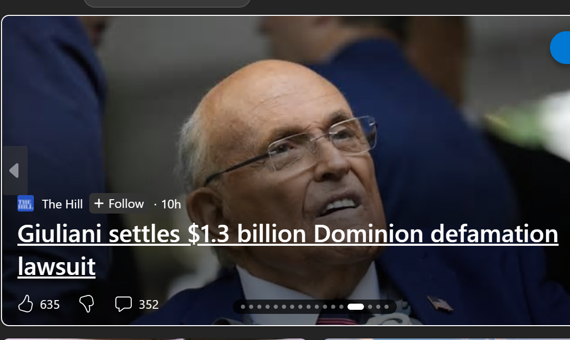 Theo hồ sơ tòa án, cựu luật sư của Tổng thống Trump, Rudy Giuliani, đã dàn xếp vụ kiện trị giá 1,3 tỷ đô la với Dominion Voting Systems vì đã lan truyền một giả thuyết sai lệch về cuộc bầu cử tổng thống năm 2020.