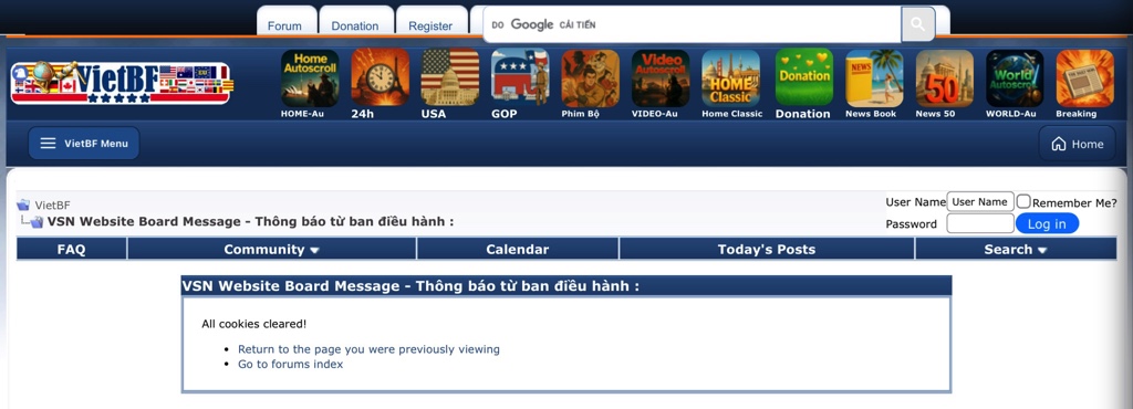 [] Sau khi vào được, chủ động bấm Log out để VietBF xóa cookie cũ (màn hình sẽ báo “All cookies cleared!” – xem hình minh họa).
