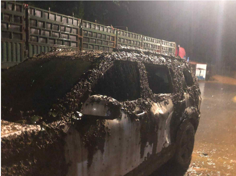 Xe ô tô chở 2 người nước ngoài bị hư hỏng, vỡ kính, bùn đất tràn vào trong xe. Ảnh: BSP