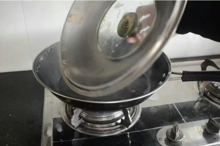 Bật bếp, đặt nắp nồi úp ngược lên miệng nồi và đun lửa lớn khoảng 3 phút, sau đó hạ lửa nhỏ thêm 3 phút. Hơi nước nóng kết hợp với giấm sẽ giúp dầu mỡ tự trôi xuống, len lỏi vào từng khe nhỏ mà bình thường khó làm sạch. Khi kết thúc, chỉ cần rửa lại nhẹ nhàng bằng nước, nắp nồi sẽ sáng bóng như mới, không còn một vết bẩn nào.