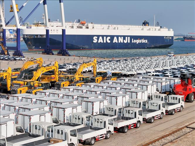 Xe ô tô chờ xuất khẩu tại cảng Yên Đài, tỉnh Sơn Đông, Trung Quốc.