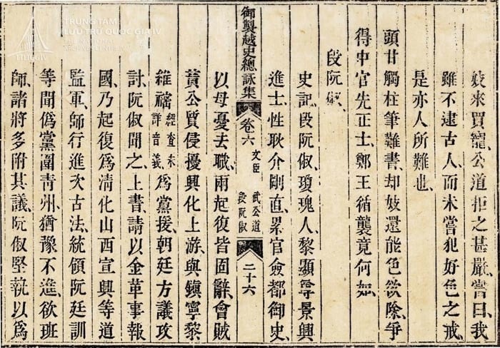 Mộc bản sách Ngự chế Việt sử tổng vịnh tập ghi về việc Võ Công Đạo nghiêm khắc từ chối khi có kẻ đem gái đẹp đến để lấy lòng ông (nguồn: Trung tâm Lưu trữ quốc gia IV).