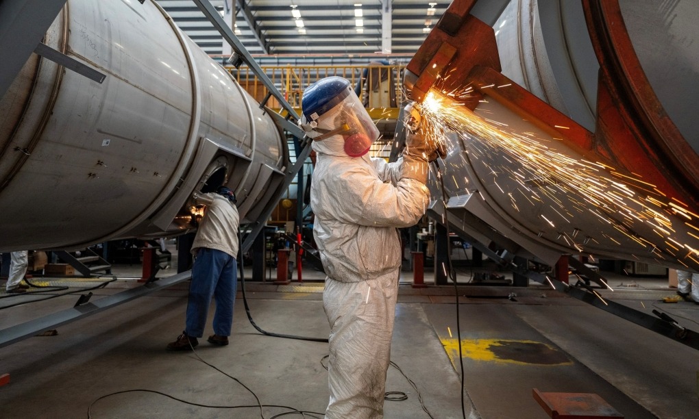 Công nhân làm việc trên dây chuyền sản xuất container bồn tại một nhà máy ở thành phố Nam Thông, tỉnh Giang Tô, Trung Quốc, hồi tháng 4. Ảnh: Reuters
