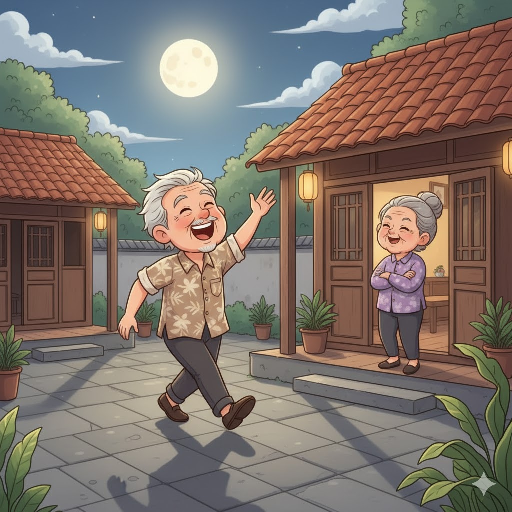 Ông Hùng đứng ngẩn ra, xong quay lưng đi ra cổng, vừa đi vừa hát thật to cho đỡ ngượng: