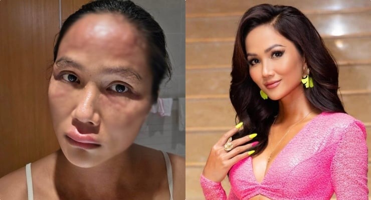 Trong loạt ảnh có thể thấy, gương mặt của H'Hen Niê sưng tấy, nhiều chỗ ửng đỏ, đặc biệt là vùng trán và môi.