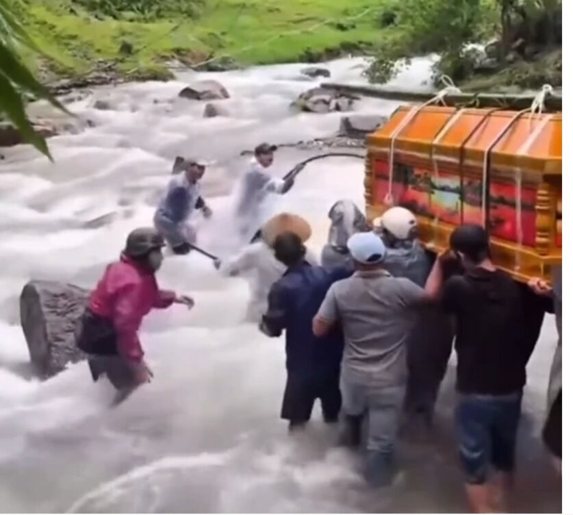 Clip ghi lại cảnh người dân mặc áo mưa, khiêng chiếc quan tài băng qua dòng nước suối chảy xiết giữa mưa lũ, khiến nhiều người không khỏi xót xa