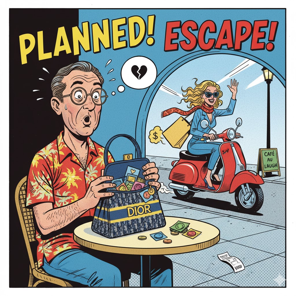 Nàng đi đón bạn tới hơn nửa tiếng, rồi một tiếng, tiếng rưỡi…, tự dung ruột hắn nóng ran, thôi chết con SH xịn của hắn, ngót nghét hai trăm triệu chứ đùa ………hắn giở cái ví Dior của nàng ra bên trong chỉ toàn giấy bản rẻ tiền và hai ba cái condom loại rẻ chửa dùng.