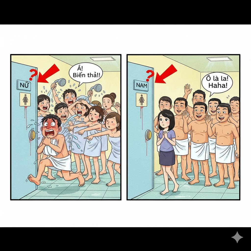 Thế nhưng, nếu tình huống ngược lại xảy ra — một cô gái lỡ đi nhầm vào phòng tắm nam, thì sao nhỉ?