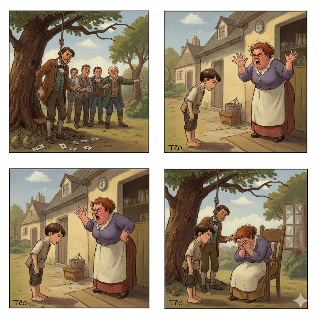 Một con bạc bị thua cháy túi, không dám về nhà, chẳng còn đường nào khác bèn thắt cổ tự tử. Những người cùng hội không ai dám đi báo tin cho gia đình nạn nhân, sợ sẽ gây sốc cho họ.