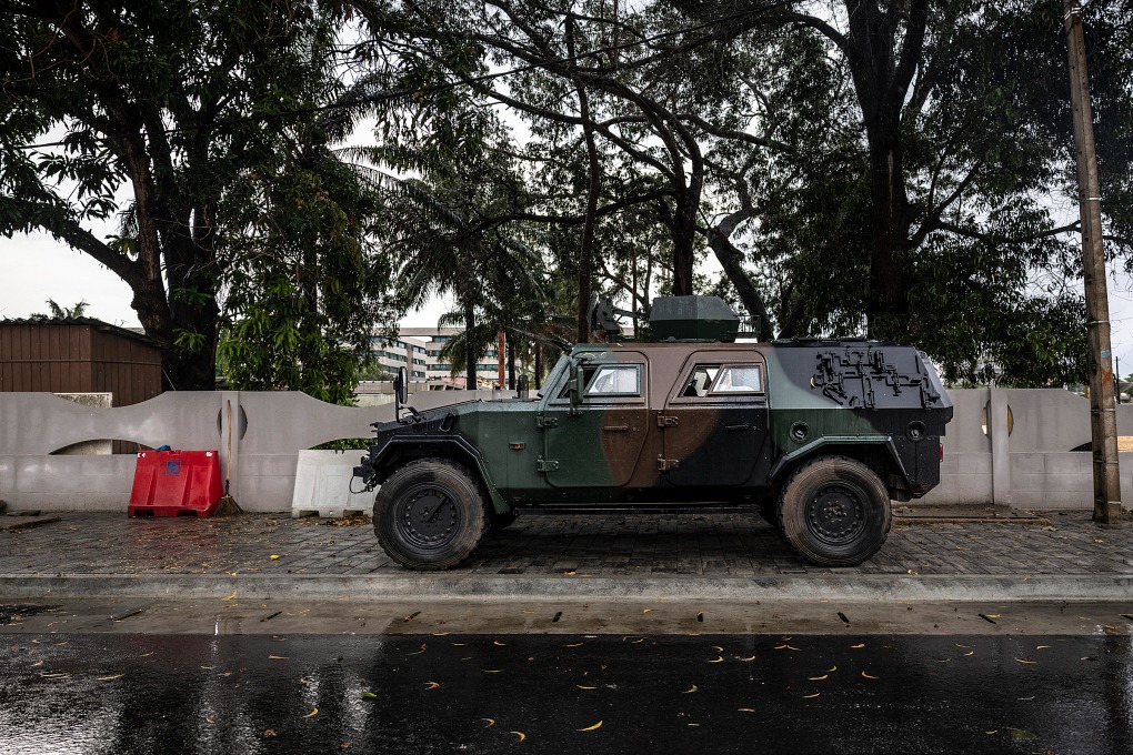 Xe thiết giáp được bố trí tại lối vào một con đường đã bị phong tỏa bên cạnh đài truyền hình quốc gia Benin ở thành phố Cotonou ngày 8/12. Ảnh: AFP