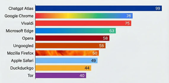 Danh sách 10 trình duyệt có mức rủi ro cao nhất về quyền riêng tư theo báo cáo của Digitain, bao gồm ChatGPT Atlas, Google Chrome, Vivaldi, Microsoft Edge, Opera, Cốc Cốc, Mozilla Firefox, Apple Safari, DuckDuckGoTor.