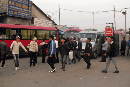 Ngay từ sáng 28/1, trong và ngoài các bến xe Hà Nội, hành khách cùng đồ đạc lỉnh kỉnh hối hả rời Hà Nội về quê ăn Tết. Khác với những năm trước, vào thời điểm này người vào bến xe không đông mà đứng dọc các tuyến đường Kim Đồng, Giải Phóng, ngã ba Pháp Vân, Phạm Hùng…