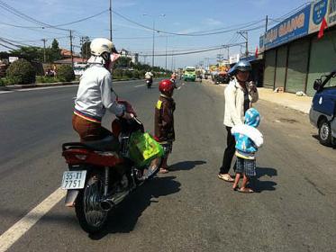Người phụ nữ chở mẹ và 2 con nhỏ suýt bị xe du lịch tông khi cán phải đinh trên Quốc lộ 1A .Ảnh: NLĐO